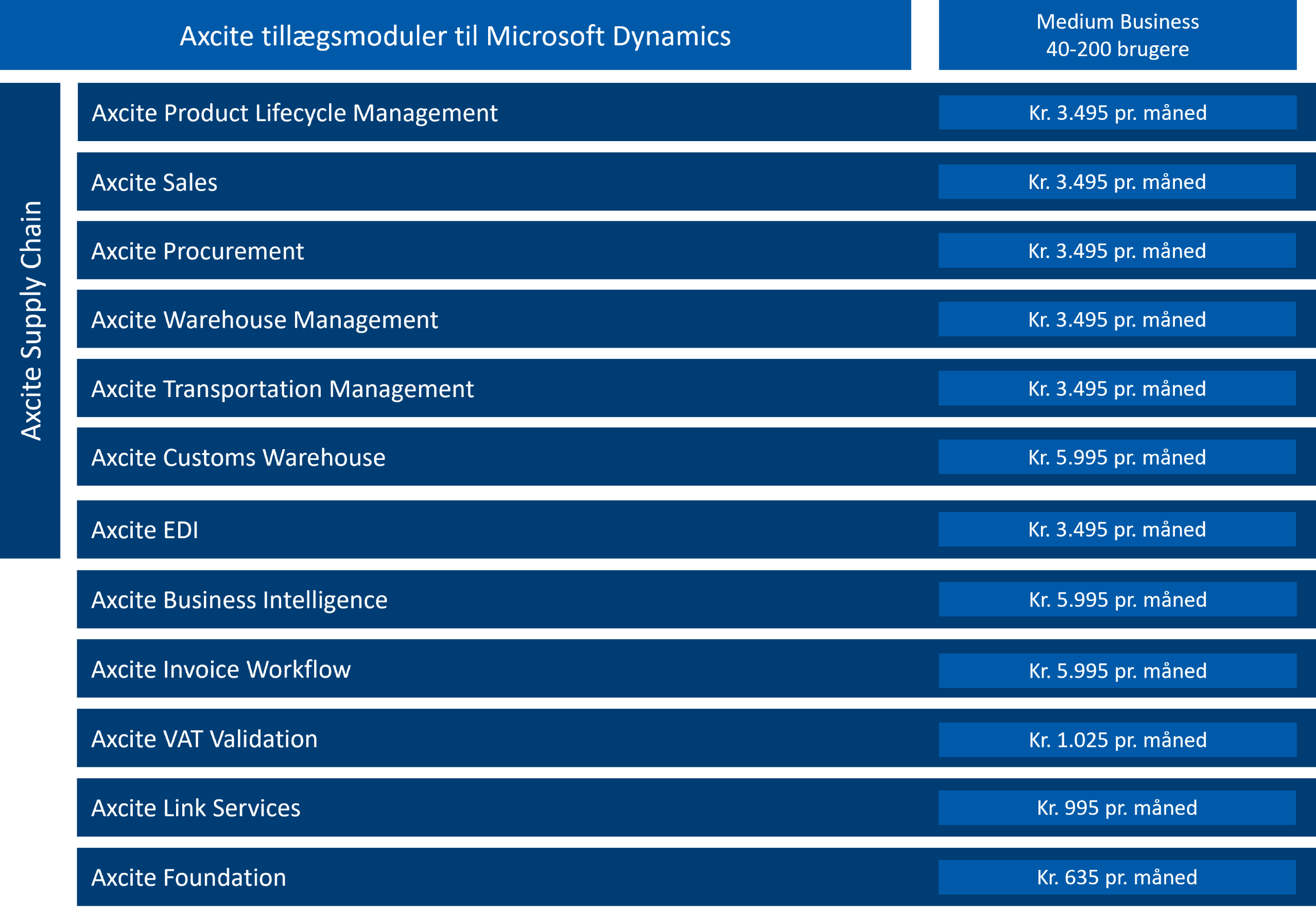 Prisoversigt pr. 1. maj 2026 for Axcite standardmoduler til Dynamics 365